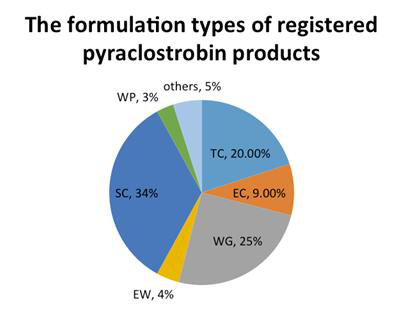 With regard to formulations, pyraclostrobin is produced mostly in SC and WDG formulations, which account for over half of its formulations.