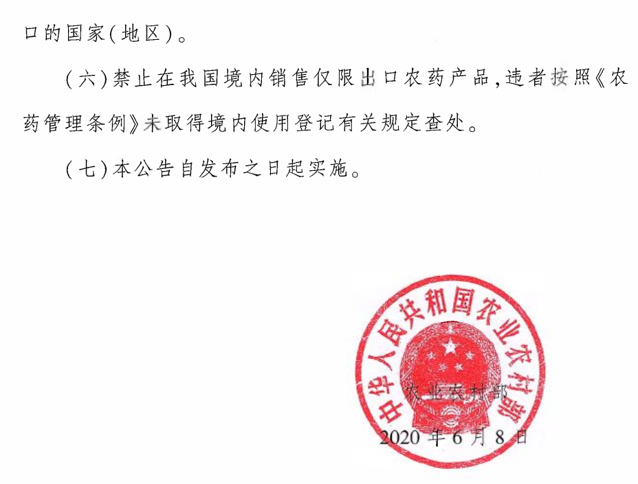 2020年6月8日,为贯彻落实国务院“放管服”改革精神, 促进农药出口贸易,优化营商环境,根据《农药管理条例》《农药登记管理办法》,农业农村部就不在我国境内使用的出口农药(简称“仅限出口农药”)产品登记有关事项发布如下公告: