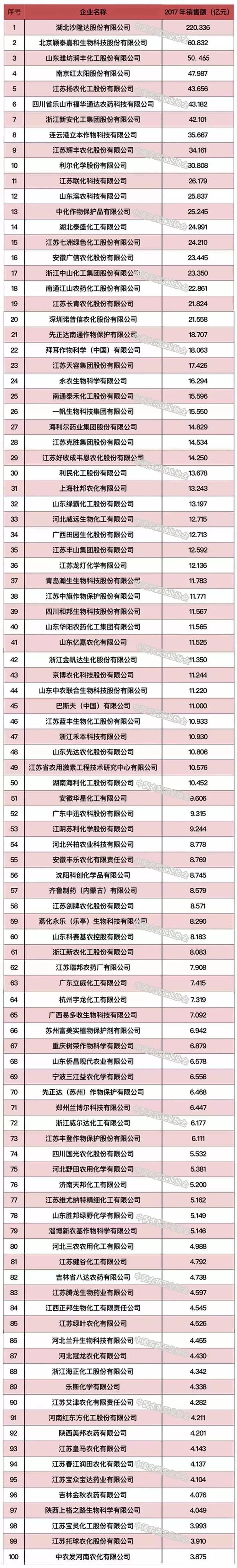 516日,2018中国农药行业销售百强企业榜单在第五届农药行业经济运行分析会上隆重发布并为获奖企业颁发了牌匾,湖北沙隆达股份有限公司以220.336亿元销售额摘得排行榜桂冠,是我国第1农药主营业务销售额超百亿的企业。北京颖泰嘉和生物科技股份有限公司和山东潍坊润丰化工股份有限公司分别以60.832亿元和50.465亿元的业绩,摘得榜眼和探花之位。