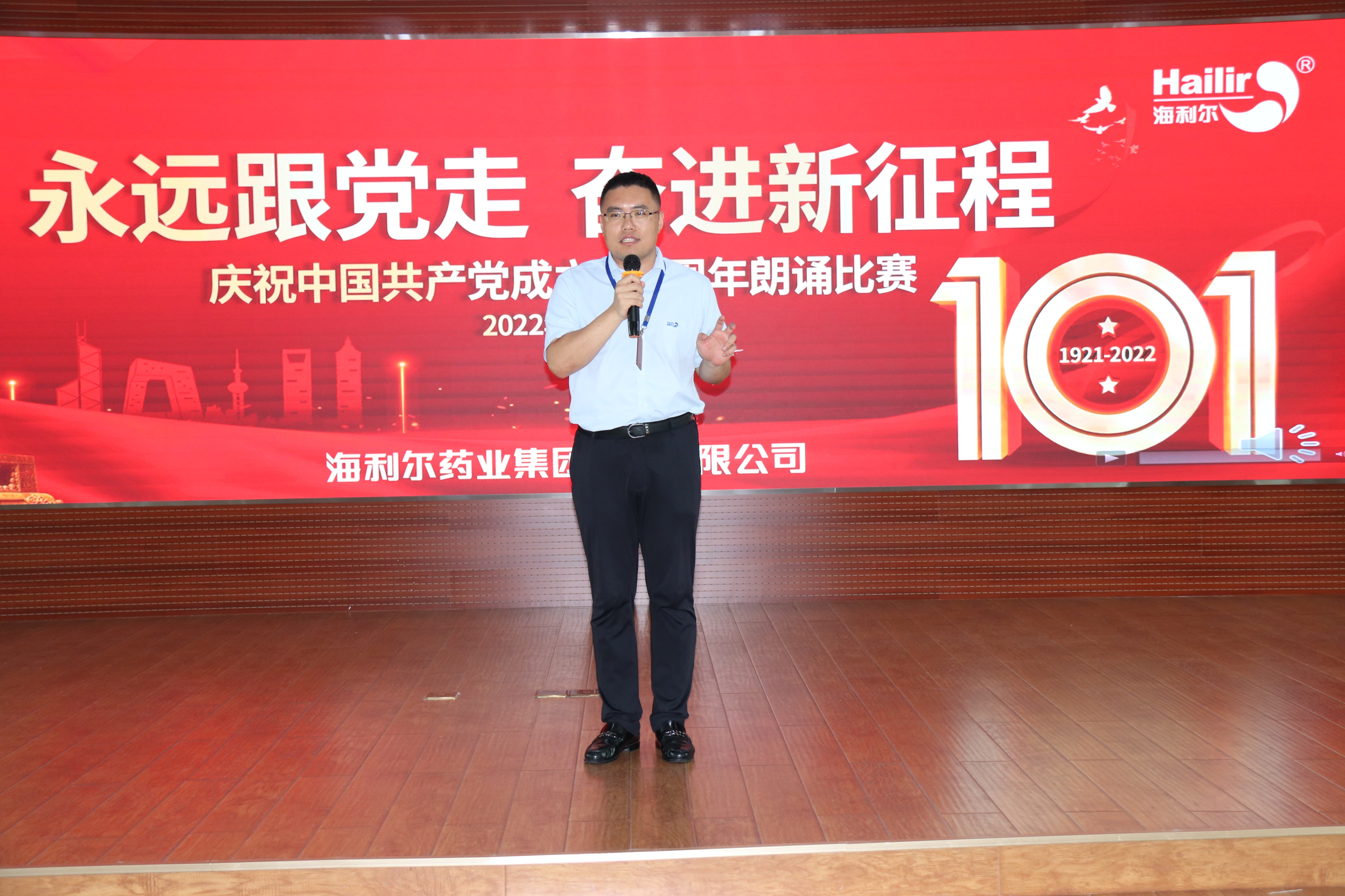 集团董事长葛尧伦、集团总裁葛家成、集团总工程师兼研发中心主任王良清、集团制剂生产总监杨勇、集团人力资源总监姜延红、集团行政管理总监谭长雁等领导出席活动并担任评委。8个参赛单位(按出场顺序)——山东海利尔工厂、国际业务中心、奥迪斯工厂、恒宁生物、青岛海利尔工厂、滕润翔、凯源祥工厂、研发中心一一登场,贡献了一场场别开生面的朗诵表演。台上朗读者声情并茂,初心激荡;台下观众席掌声阵阵,同心飞扬。一场充满激情与创意、对党、对祖国、对海利尔爱的表白深情演绎。