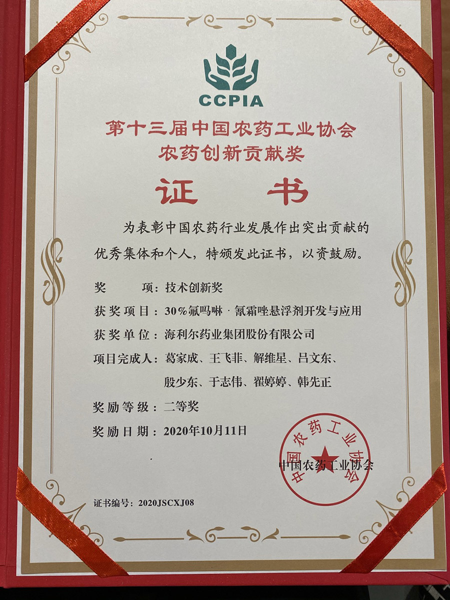 10月11日,第十三届中国农药工业协会农药创新贡献奖名单揭晓,sunbet申搏荣获技术创新奖二等奖。