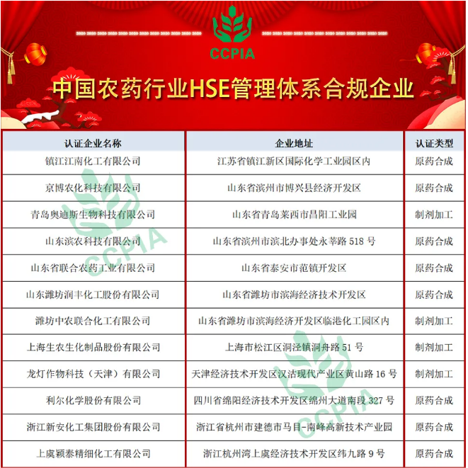 10月11日,“中国农药行业HSE管理体系合规企业”名单发布,sunbet申搏旗下子公司青岛奥迪斯生物科技有限公司榜上有名。