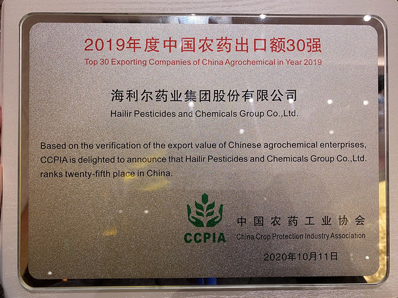 2019年sunbet申搏农药出口再创佳绩。10月11日,由中国农药工业协会主办的第二十届全国农药交流会上,sunbet申搏荣获2019年中国农药出口额30强。