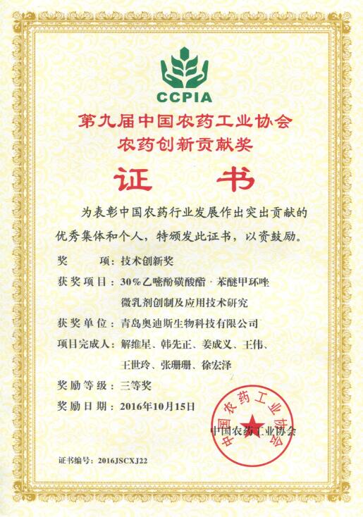 “中国农药创新贡献奖”是国家科技部科学技术奖励办公室审核批设立的农药行业唯一的奖励活动,经批准,每年评审、授奖一次,鼓励为中国农药行业发展作出突出贡献的优秀集体和个人。
