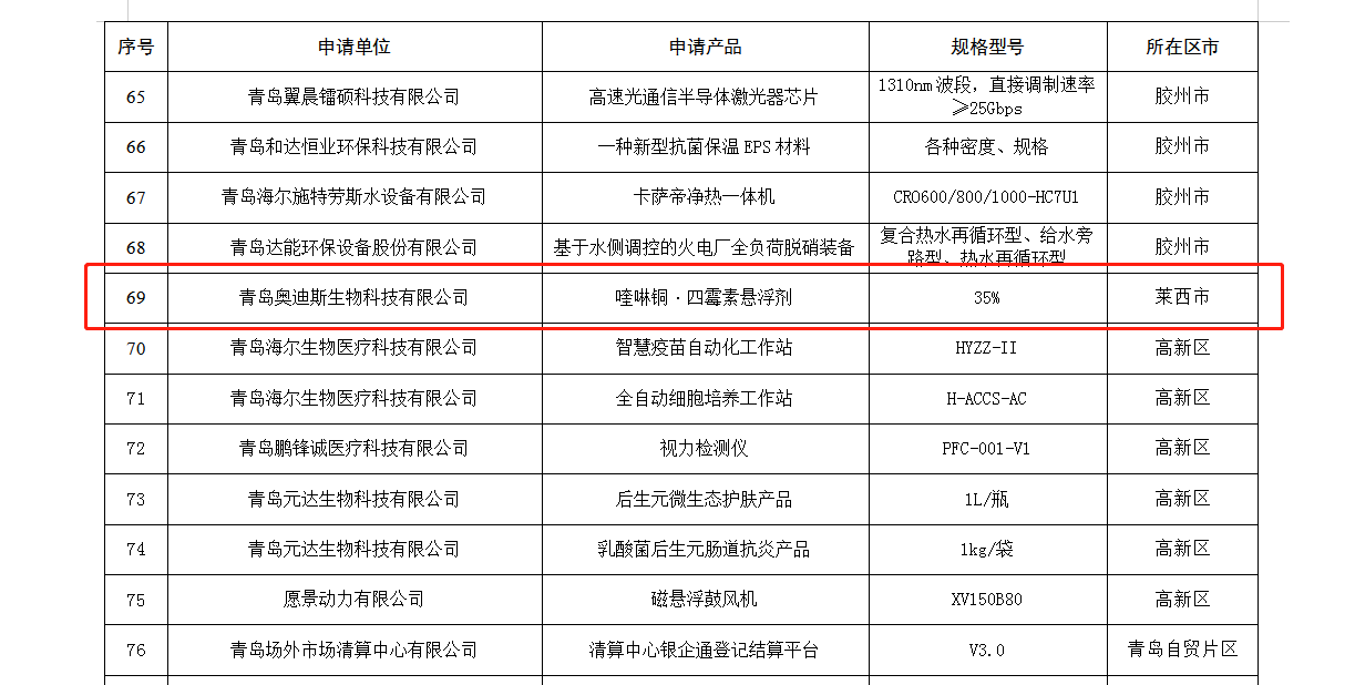 近日,青岛市工业和信息化局公布了青岛市创新产品推荐目录(2023年度第一批)名单,sunbet申搏子公司奥迪斯生物生产的35%喹啉铜·四霉素悬浮剂(阿尔达)产品成功入选。
